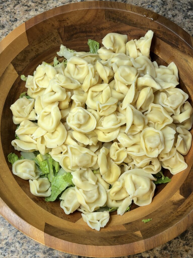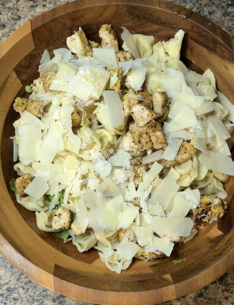 - In a large bowl, combine the cooled tortellini, chopped chicken, chopped romaine, shaved Parmesan, and most of the dressing. Toss until everything is evenly coated.
