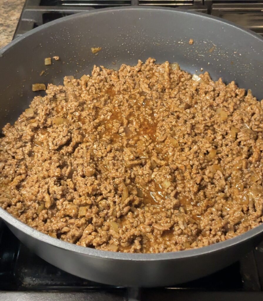 - In a large skillet over medium heat, brown the ground beef with the diced onion until fully cooked and onions are softened. Drain excess grease. Stir in taco seasoning and ¼ cup water. Reduce heat to low and simmer 3–5 minutes until thickened. Remove from heat.