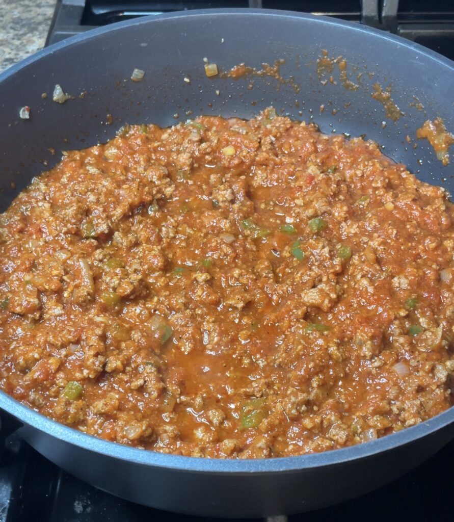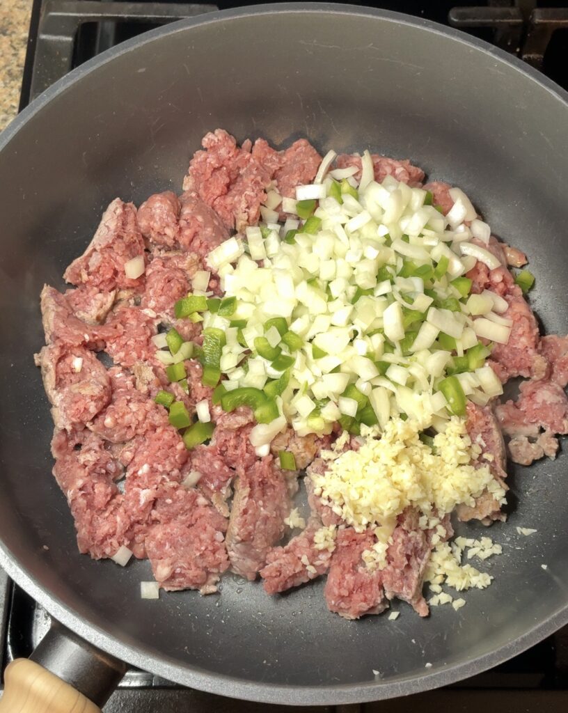 Start by heating a large skillet over medium heat. Add the ground beef, diced onion, green bell pepper, and minced garlic. Cook until the meat is fully browned and the vegetables are softened. Drain off the excess grease.