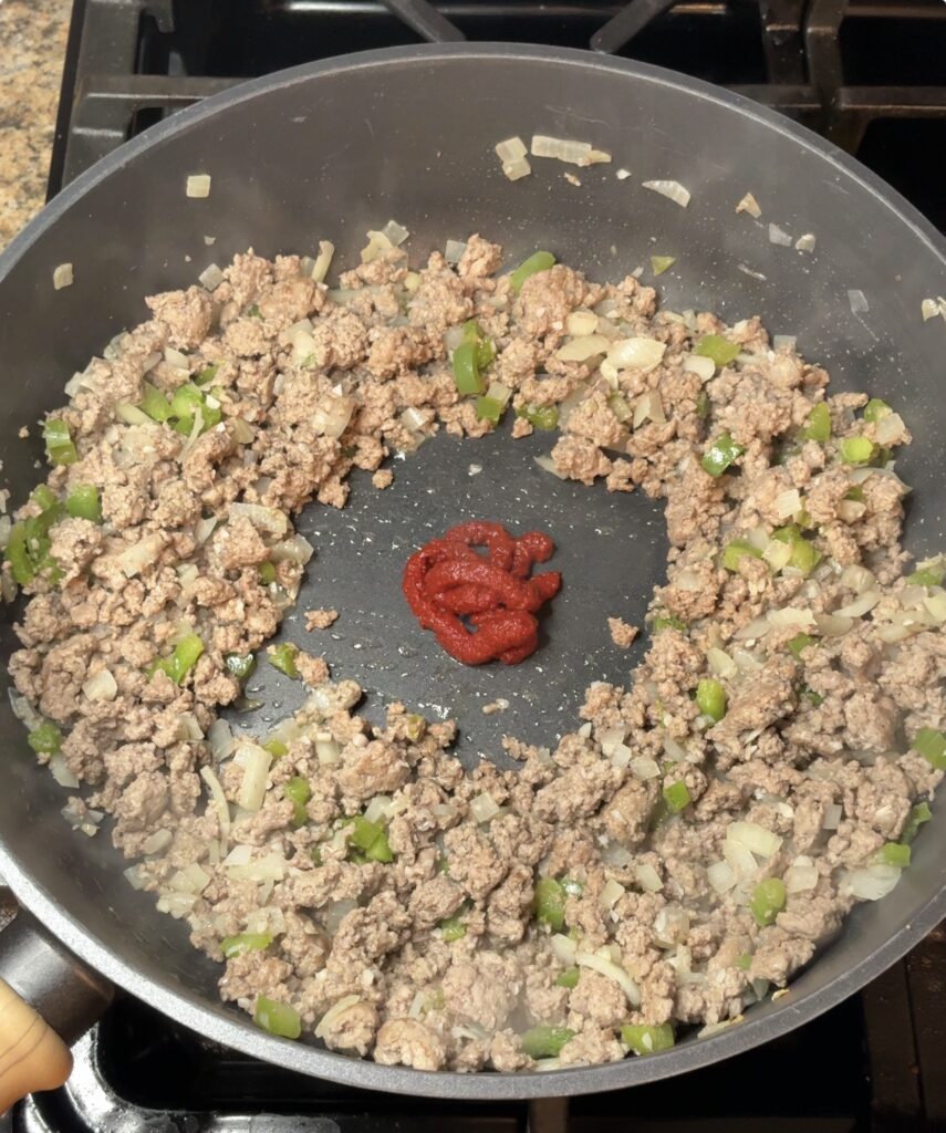 - Heat a large skillet over medium heat. Add ground beef, onion, bell pepper, and garlic. Cook until browned. Drain grease. Stir in tomato paste and cook for 3 minutes.