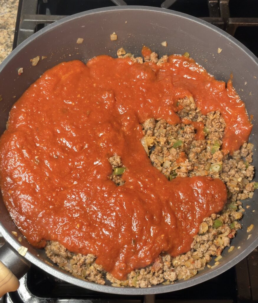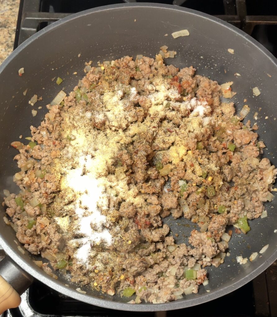 Next, stir in the tomato paste and let it cook for about three minutes. This step deepens the flavor and keeps the sauce from tasting flat. Now sprinkle in the Calabrian chili blend, Nature’s Seasons, garlic powder, onion powder, and sugar. Stir well so the spices coat the meat evenly.