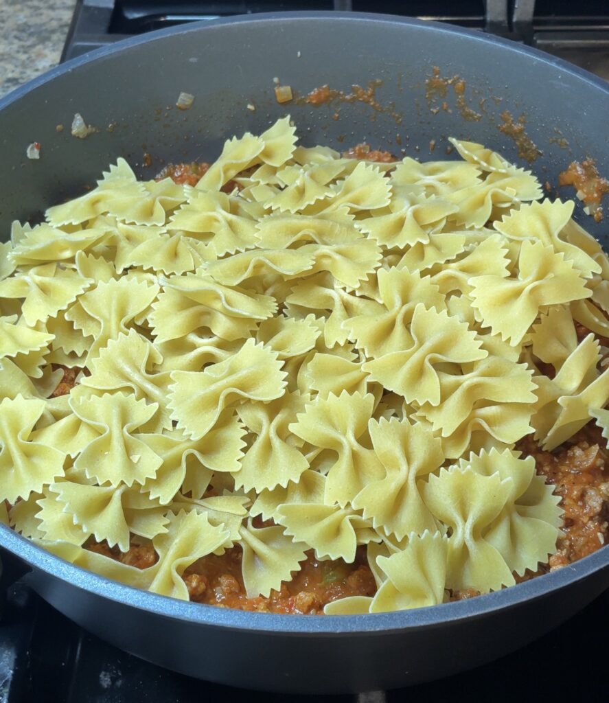 Add the dry bowtie pasta directly into the skillet along with 2½ cups of chicken broth. Stir well and bring the mixture to a boil.