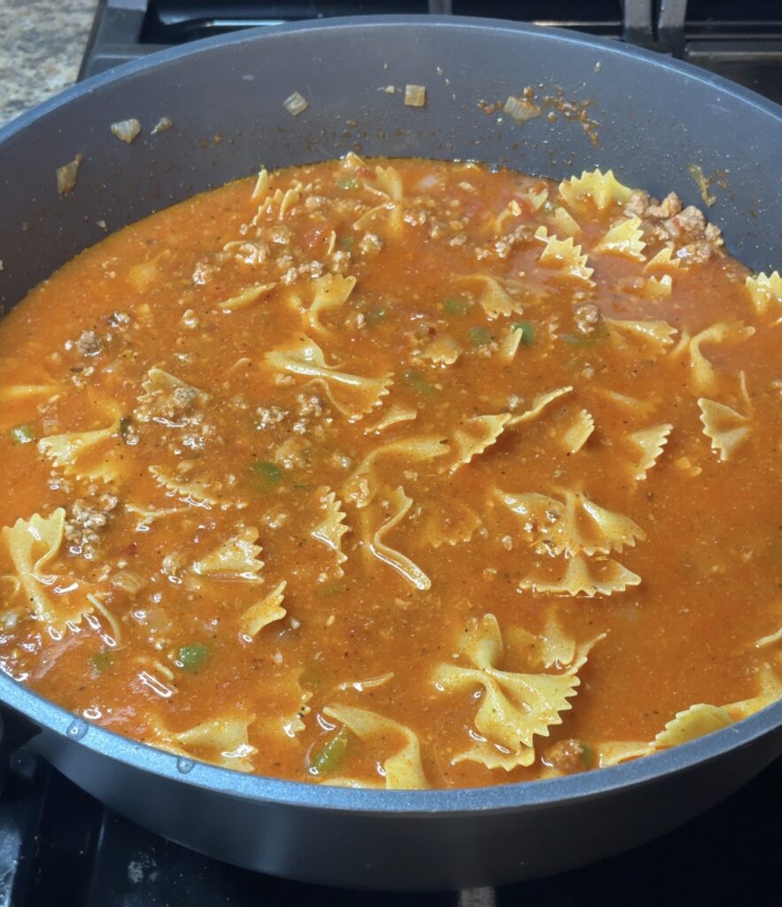 - Cover, reduce to simmer, and cook 18–20 minutes, stirring occasionally, until pasta is tender.