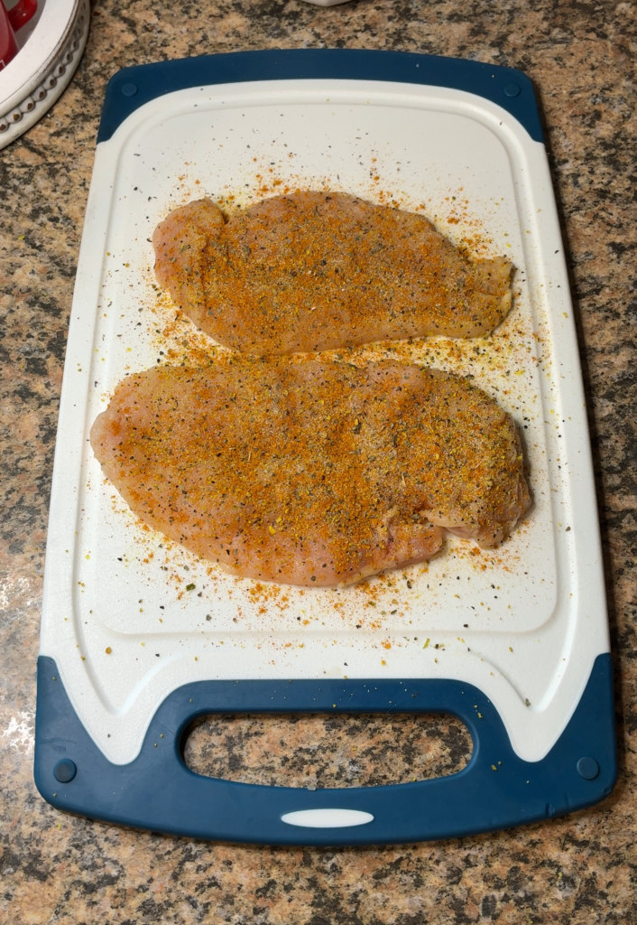 - Season chicken on both sides with lemon pepper, garlic powder, onion powder, Italian seasoning, and smoked paprika.