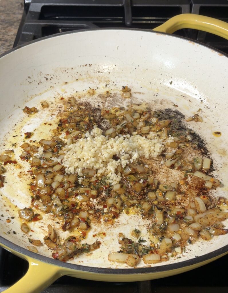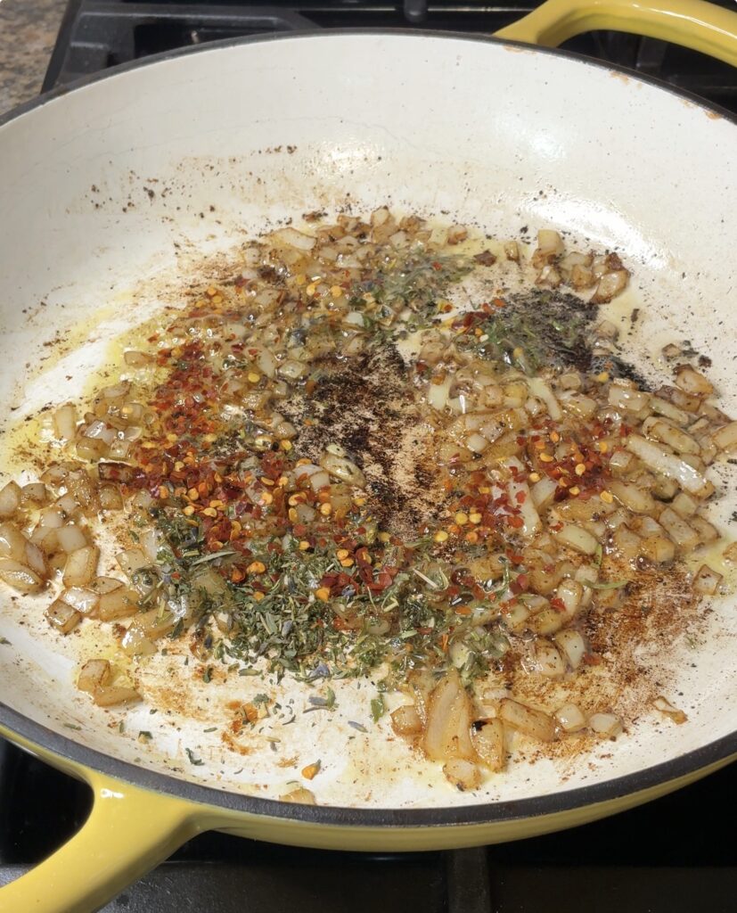 - Add remaining butter and diced onion. Cook 2–3 minutes until softened. Stir in herbs de Provence and red pepper flakes. Add garlic and cook 1 minute.