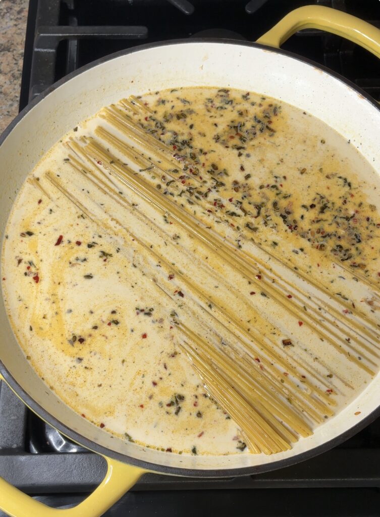 - Add linguine and reduce to a simmer. Cook 10–12 minutes, stirring frequently, until pasta is al dente.