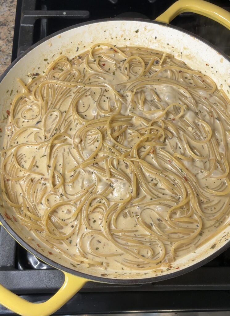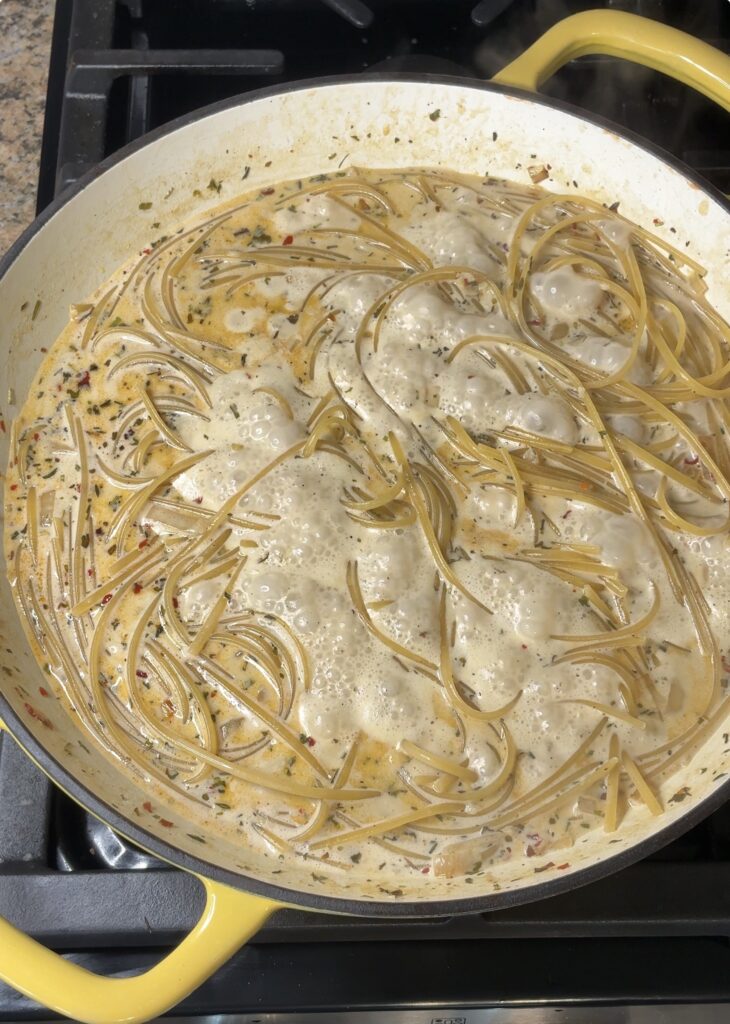 Add the linguine and reduce the heat to medium so it stays at a steady simmer. Let the pasta cook for about 10–12 minutes, stirring frequently, until it’s al dente and the sauce has thickened.