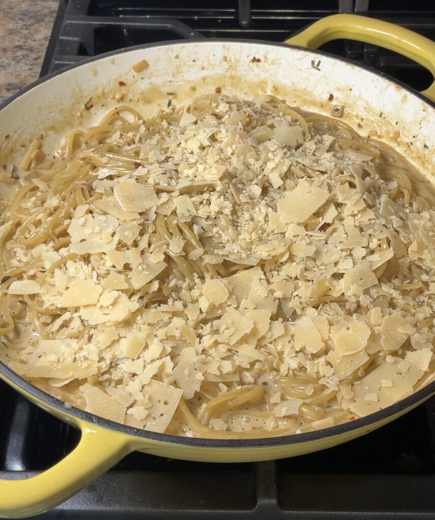 - Fresh Parmesan cheese – melts into the sauce and thickens it (freshly grated is best, but shaved works too)