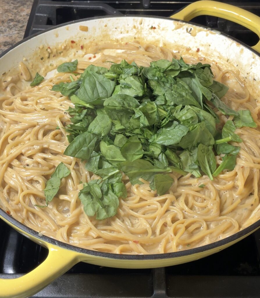 Add in the chopped spinach and fresh lemon juice, stirring until the spinach wilts. If the sauce thickens too much (especially as it sits), just add a splash of chicken broth to loosen it back up.