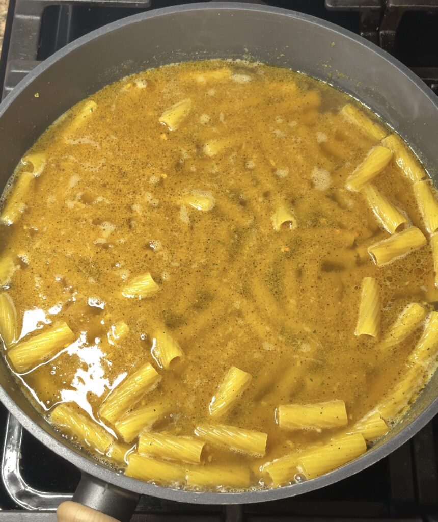Add the uncooked rigatoni along with the chicken broth. Stir well, making sure most of the pasta is submerged. Bring it to a boil.