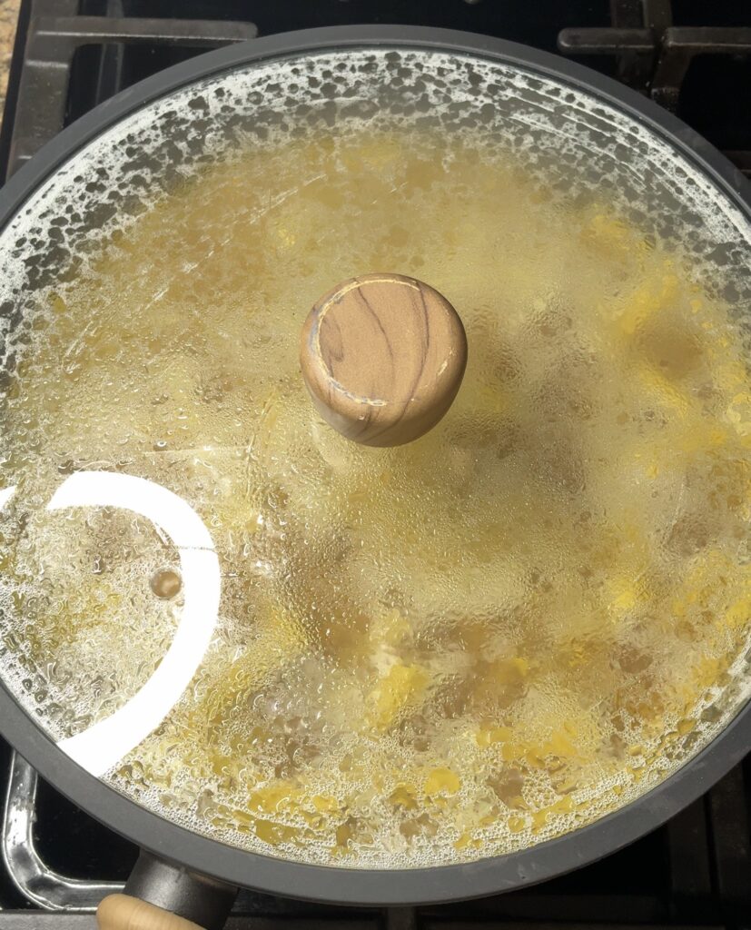 Once boiling, cover the pan with a lid, reduce the heat to a simmer, and cook for 10–12 minutes. Stir occasionally so the pasta doesn’t stick, and cook until it’s tender and most of the liquid has been absorbed.