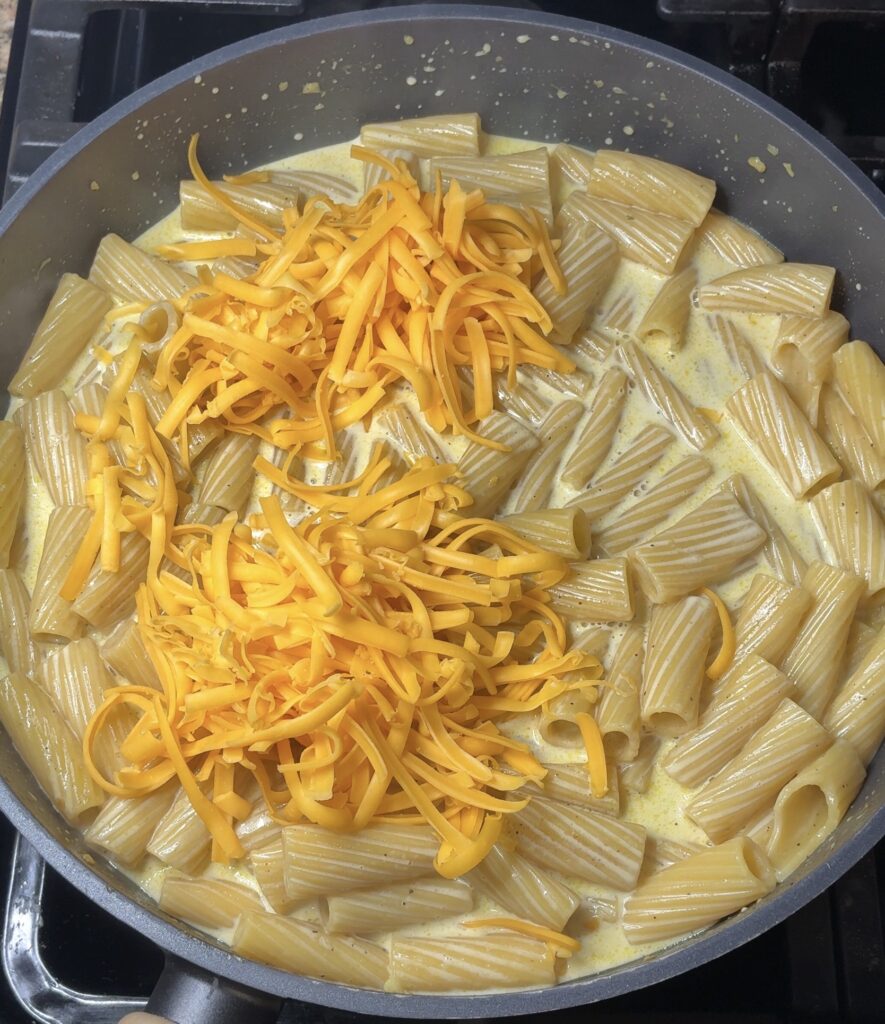 Reduce the heat to low and stir in the heavy cream. Then add the freshly grated cheddar cheese, stirring until it’s completely melted and the sauce is smooth and creamy.
