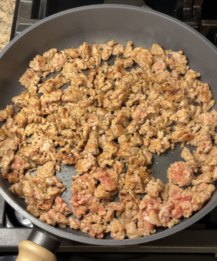In a large skillet over medium heat, brown the Italian sausage until fully cooked. Be sure to set aside about 1 tablespoon of the cooked sausage for topping later.