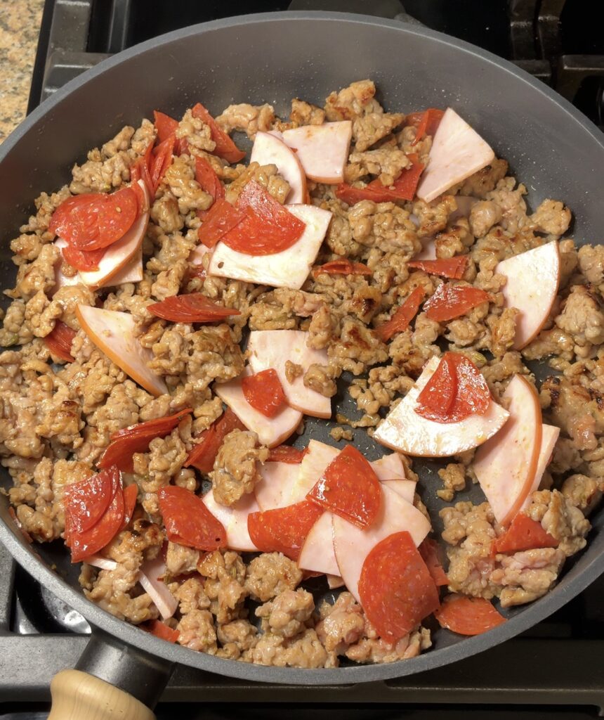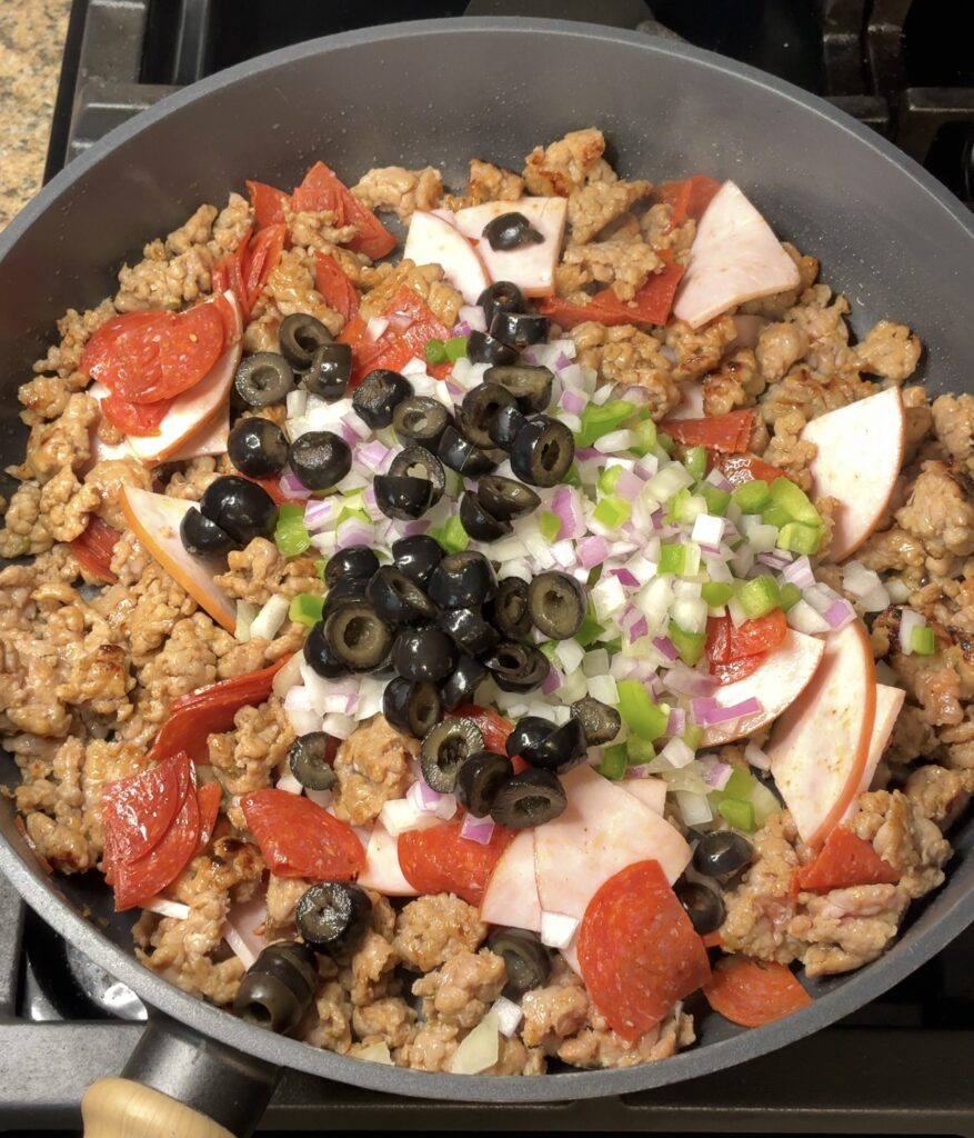 Add in the chopped Canadian bacon, chopped pepperoni, diced red onion, diced yellow onion, green bell pepper, and black olives. Cook for a few minutes until the vegetables begin to soften and the flavors start to come together.