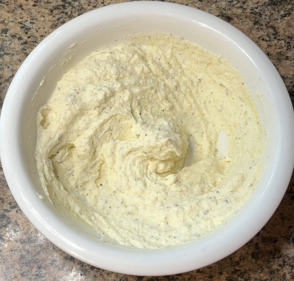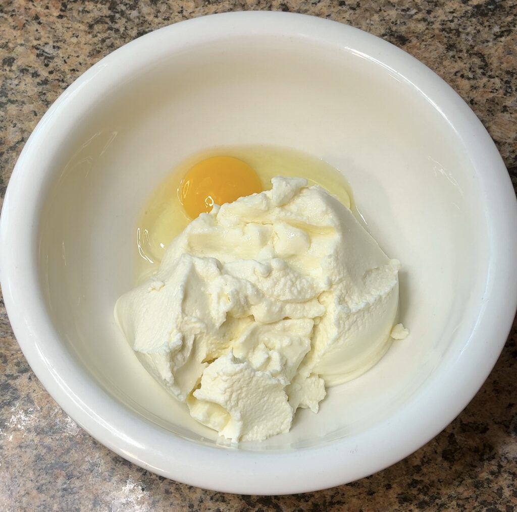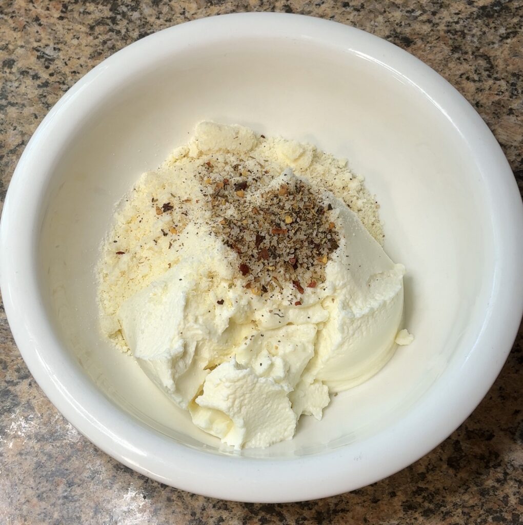 In a separate bowl, mix together the ricotta cheese, egg, Parmesan cheese, and a pinch of Italian seasoning until smooth and combined.