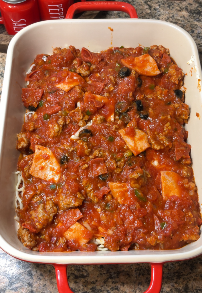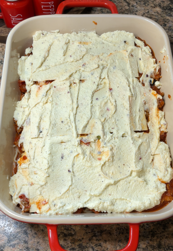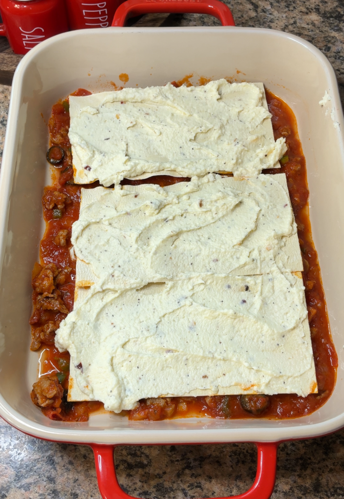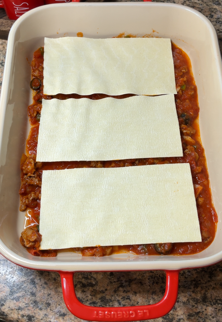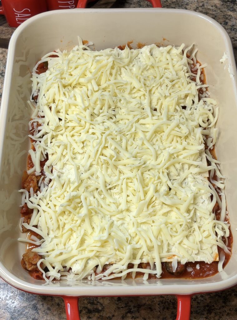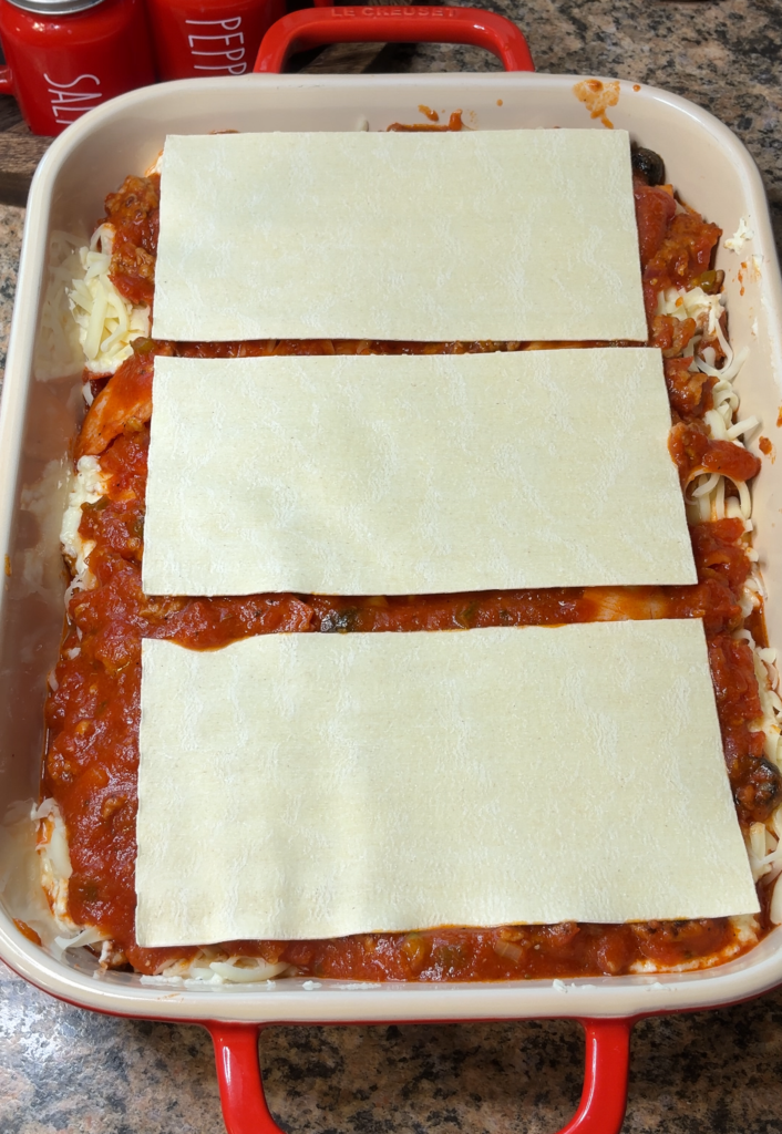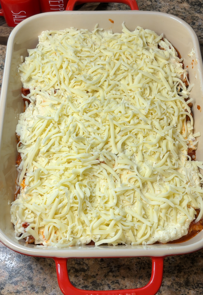 - Add final noodles, remaining sauce, and top with 2 cups mozzarella.