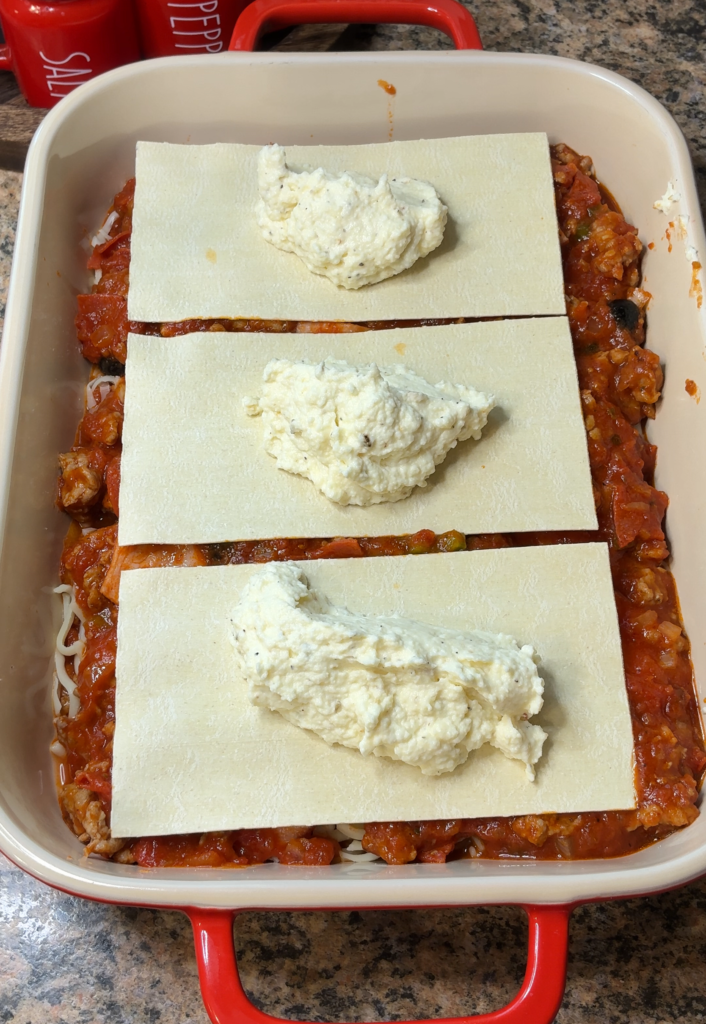 - Layer 3 noodles, half the ricotta, 1 cup mozzarella, and sauce.