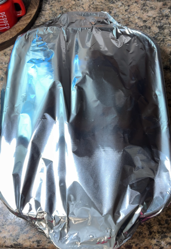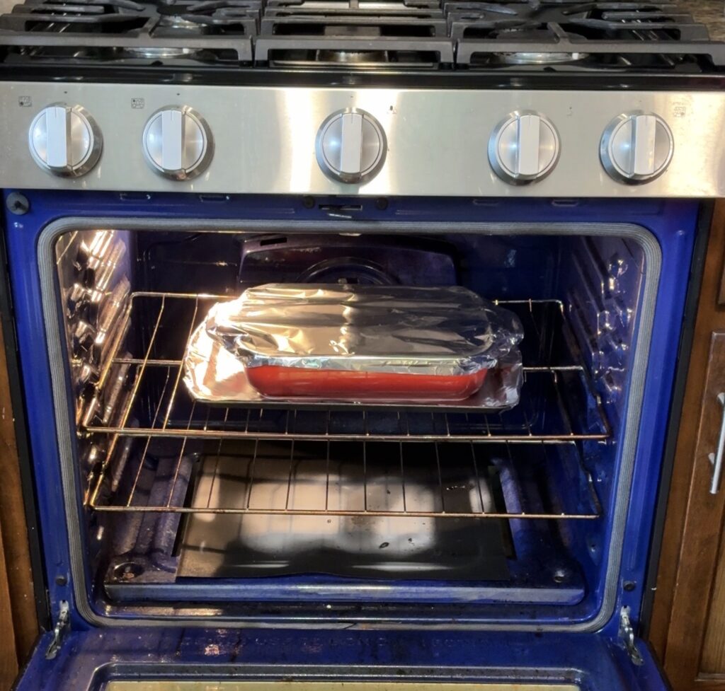 Spray a piece of aluminum foil with cooking spray and cover the dish tightly. Place the baking dish on a foil-lined baking sheet to catch any overflow.