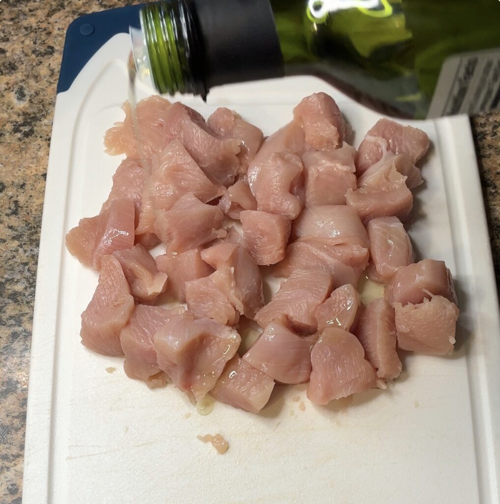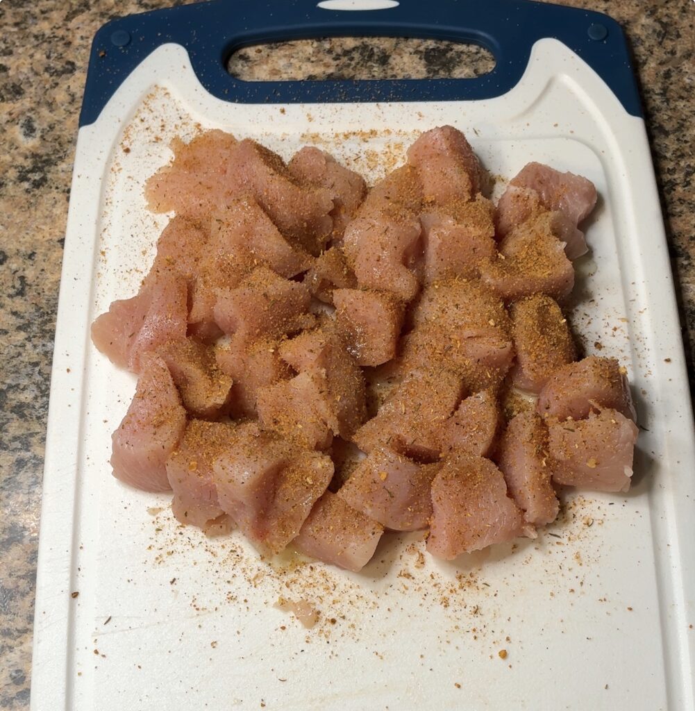 Start by cutting your chicken breast into bite-size pieces. Drizzle lightly with olive oil and season generously with the Sweet Pepper Honey Chicken seasoning. Toss until evenly coated.