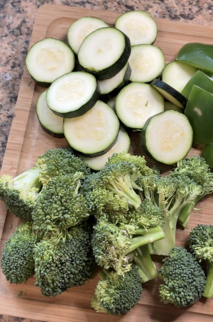 Slice the smoked turkey sausage into thick coins. Chop the bell peppers, red onion, zucchini, and broccoli into uniform pieces so everything cooks evenly. Mince the garlic and set it aside.