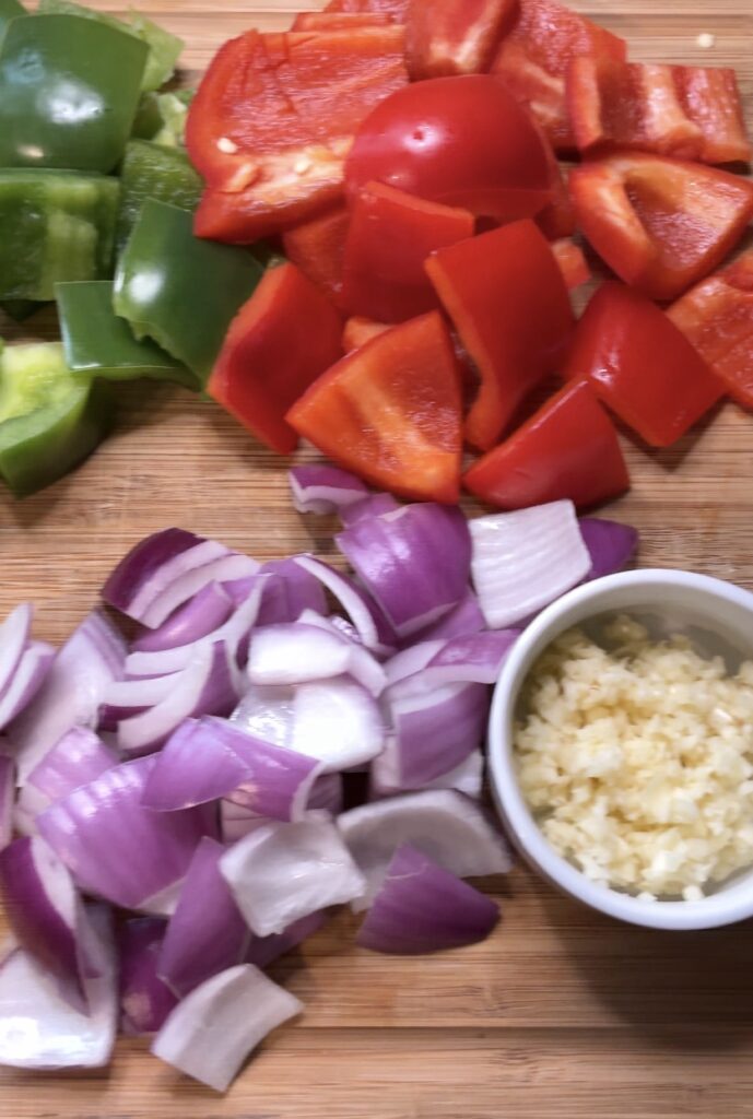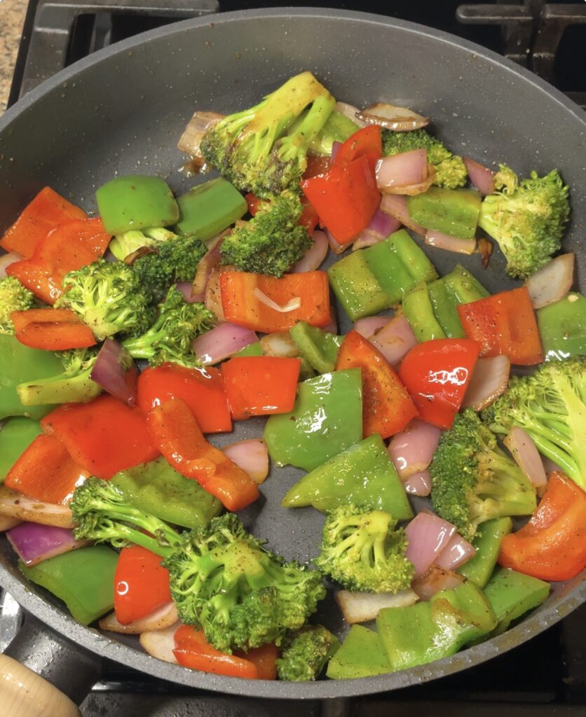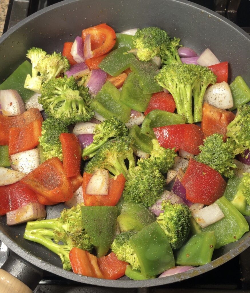 Without wiping out the pan, add the broccoli, bell peppers, and red onion. Season with salt and black pepper. Sauté for about five minutes, or longer if you prefer softer vegetables. I like mine slightly crisp for texture and color.