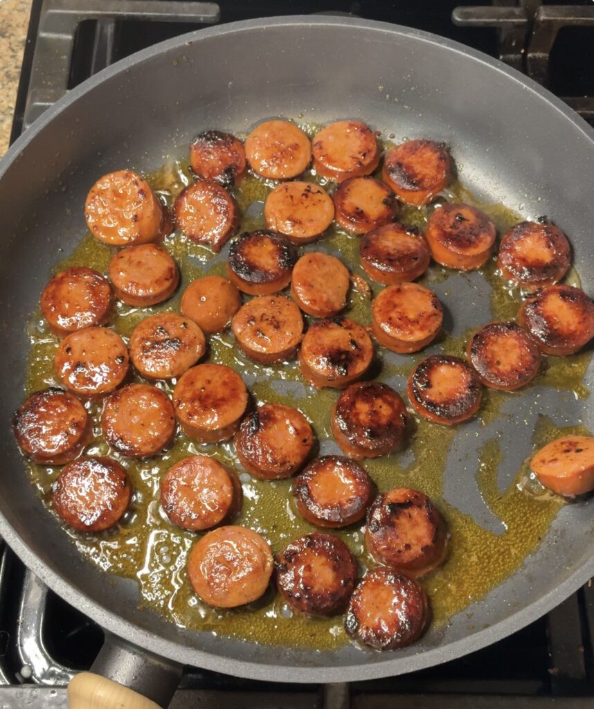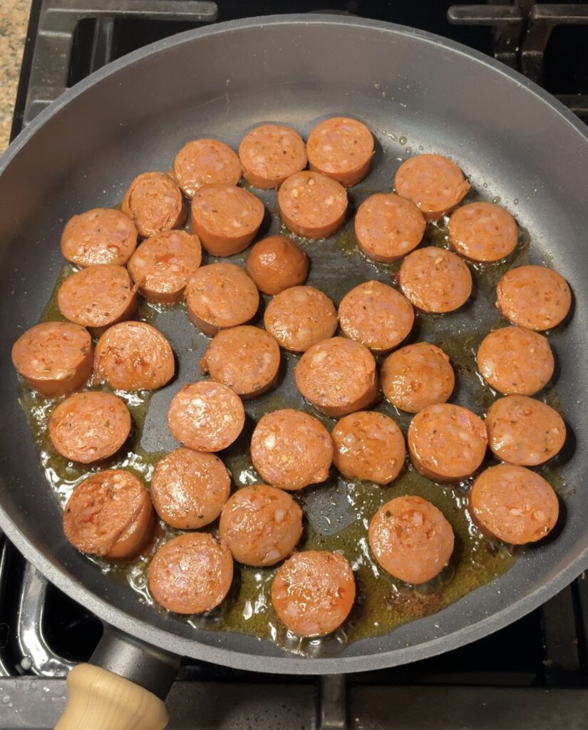 Heat 1 tablespoon of avocado oil in a large skillet over medium-high heat. Once hot, add the sliced sausage in a single layer. Let it cook undisturbed so it develops a golden brown crust. Flip and cook until nicely caramelized, then remove and set aside.
