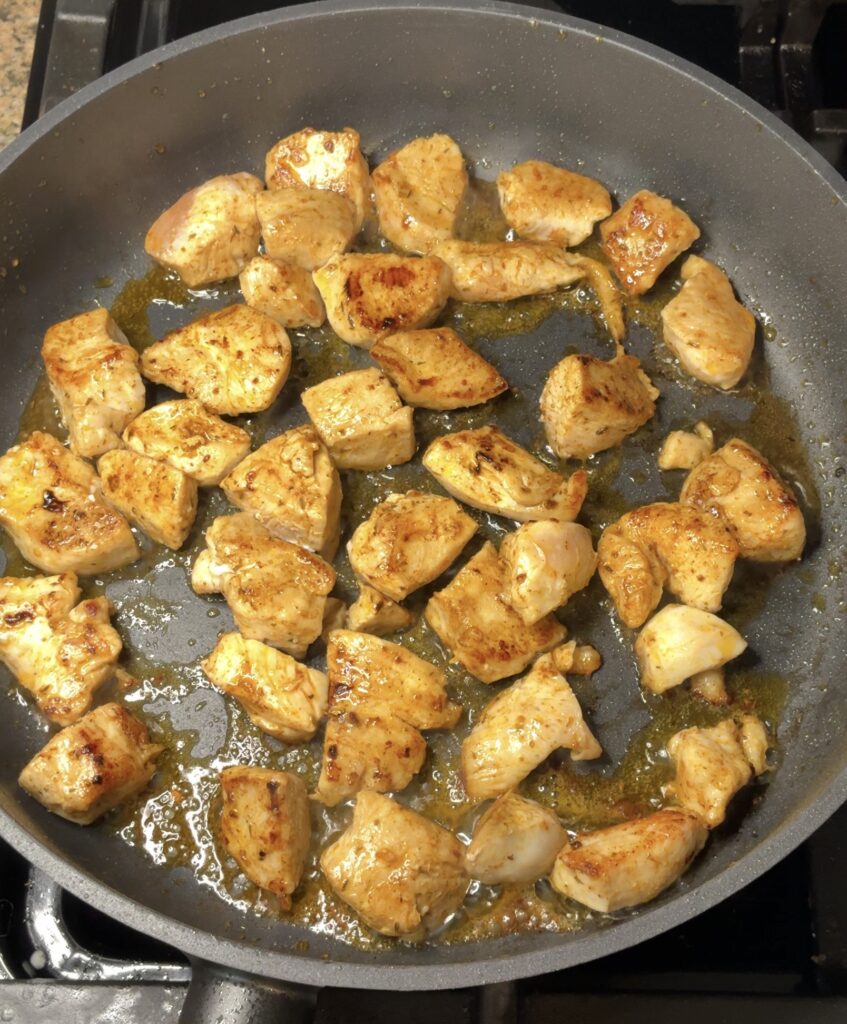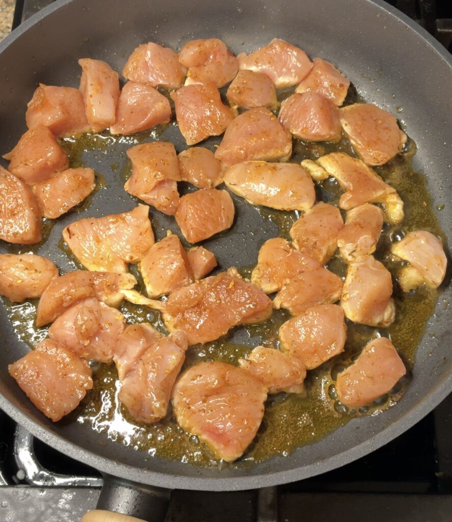 In the same skillet, add the seasoned chicken. Spread the pieces out so they aren’t crowded. Let them cook without constantly stirring so they develop light browning. Cook until fully done, then remove and set aside with the sausage.