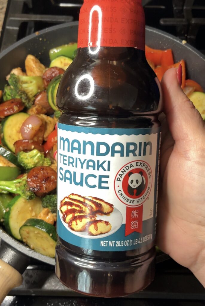 Return the sausage and chicken to the skillet. Reduce the heat slightly and add 2–3 tablespoons of mandarin teriyaki sauce. Toss everything together and let it cook for another minute or two until glossy and evenly coated.